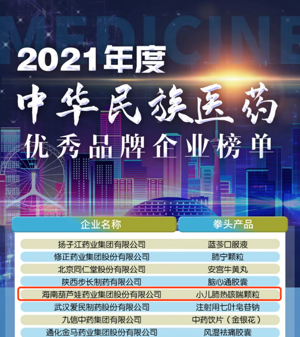 12月29日,全国工商联医药业商会发布了“2021年度中华民族医药优秀品牌企业榜单”,SG胜游药业集团凭借黄金单品小儿肺热咳喘颗粒(4克)实力登榜。